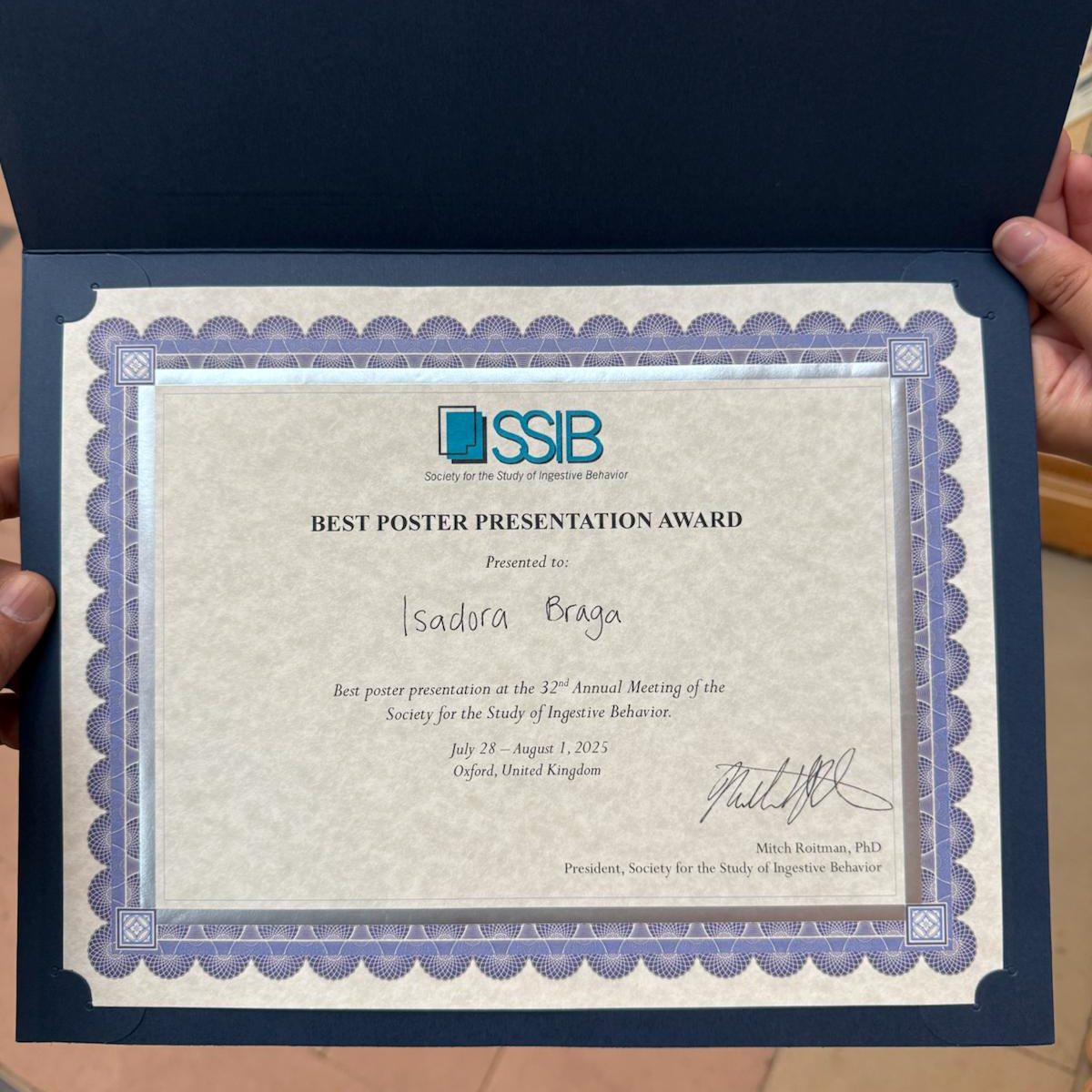 – Congratulations to rising star graduate student Isadora Braga on winning the Best Poster Presentation award at this year’s meeting of the Society for the Study of Ingestive Behavior in Oxford, UK. Her poster showcased her research on vagal remodeling in the pathogenesis of obesity.